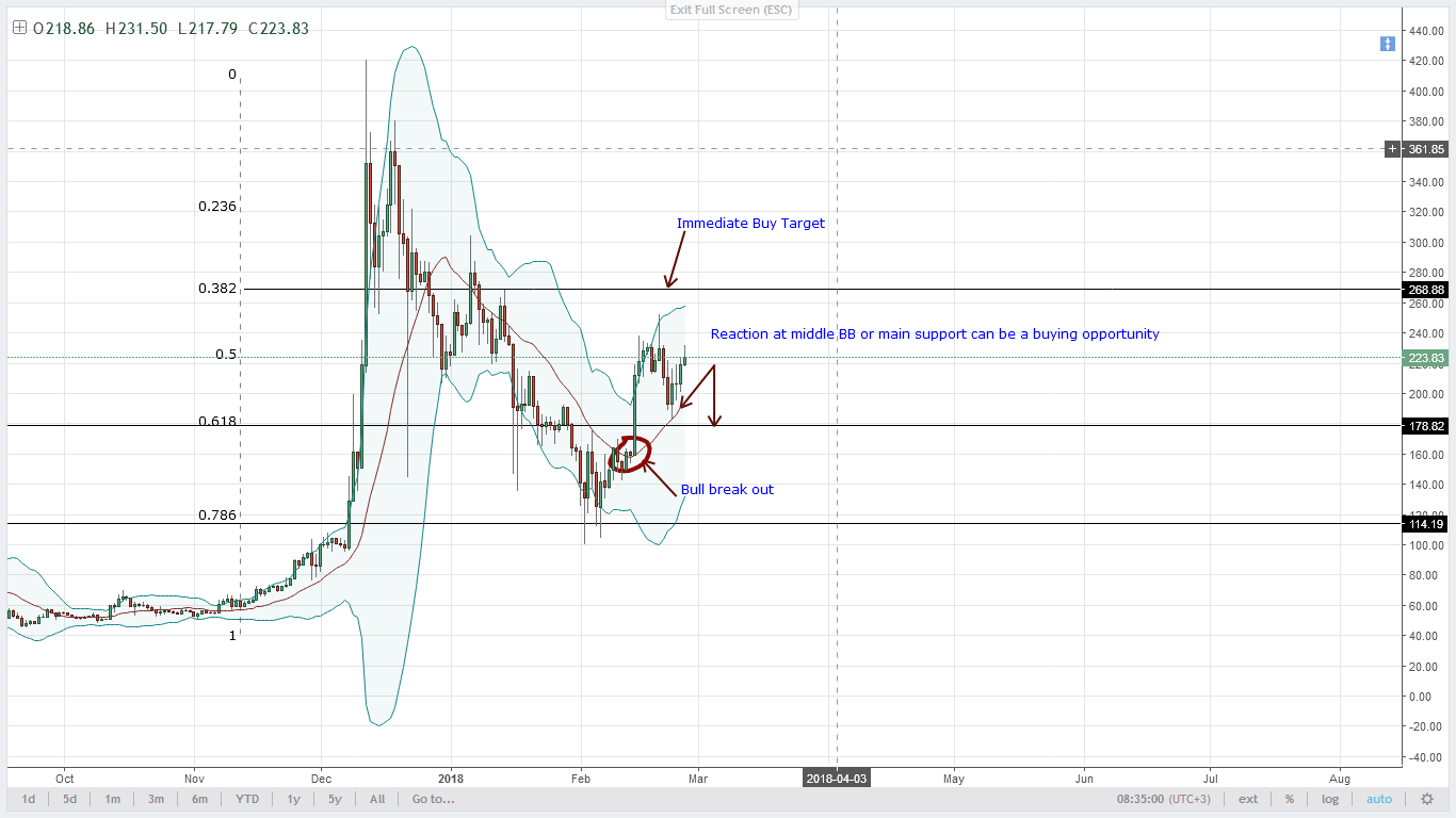 Если этого не произойдет, цены упадут до средней линии BB. В таком случае мы можем забыть на короткое время о тестировании уровня $270, так как цены LTC будут колебаться в боковом диапазоне от $170 до $220.