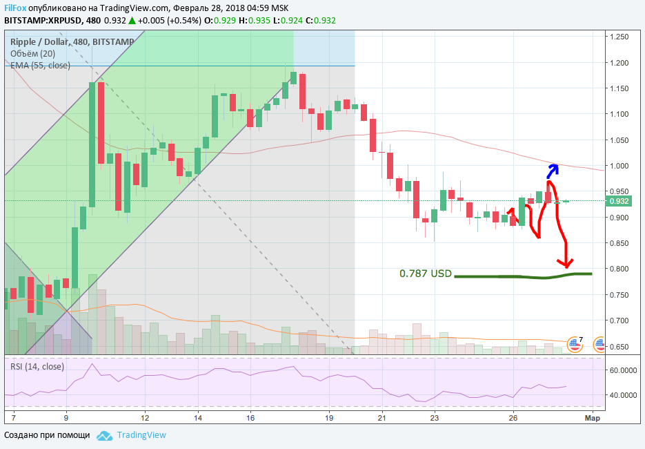 А вот Ripple, вчера, не хватило динамики, для того чтобы пробить уровень сопротивления скользящей средней EMA 55 на четырёхчасовом тайм-фрейме, но дневной максимум на отметке 0.960 USD, приблизил нас к этому событию. Если сегодня цена преодолеет этот ключевой уровень сопротивления, то в скором времени целевой уровень «один доллар за рипл» будет достигнут.