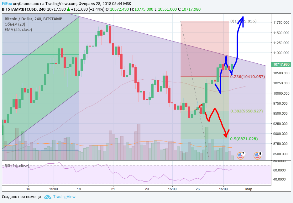 Почти двенадцать часов понадобилось Bitcoin, чтобы преодолеть мощное сопротивление на уровне 23.6% фибо (10 410.00 USD) и ещё двенадцать, чтобы закрепиться над этим уровнем. Цена на Bitcoin сейчас очень близка к тому, чтобы пробить верхнюю границу коридора глобального даун-тренда (фиолетового цвета). Это необходимое, но не достаточное условие, чтобы в ближайшее время, больше не возвращаться к ценам уровня восемь тысяч. Для этого цене ещё предстоит показать уверенный рост, преодолев ключевое сопротивление на уровне 11 800.00 USD. Мы помним, как именно на этом уровне, 20 февраля, некоторые торговые площадки уже «праздновали» двенадцатитысячный уровень цены, а на следующий день разворотная фигура «голова-плечи» посеяла панику среди инвесторов, угрожая глобальным даун-трендом. Пока цена пары BTC/USD не закрепится выше уровня 12 000.00 USD, говорить о том, что опасность сползания цены к уровню, обозначенному красной стрелкой, миновала - нельзя! Потенциал для дальнейшего роста есть, показатель относительной силы RSI находится на отметке 60%, то есть ещё не вошел в зону перекупленности, и сигнализирует о возможностях продолжения положительной динамики рынка.