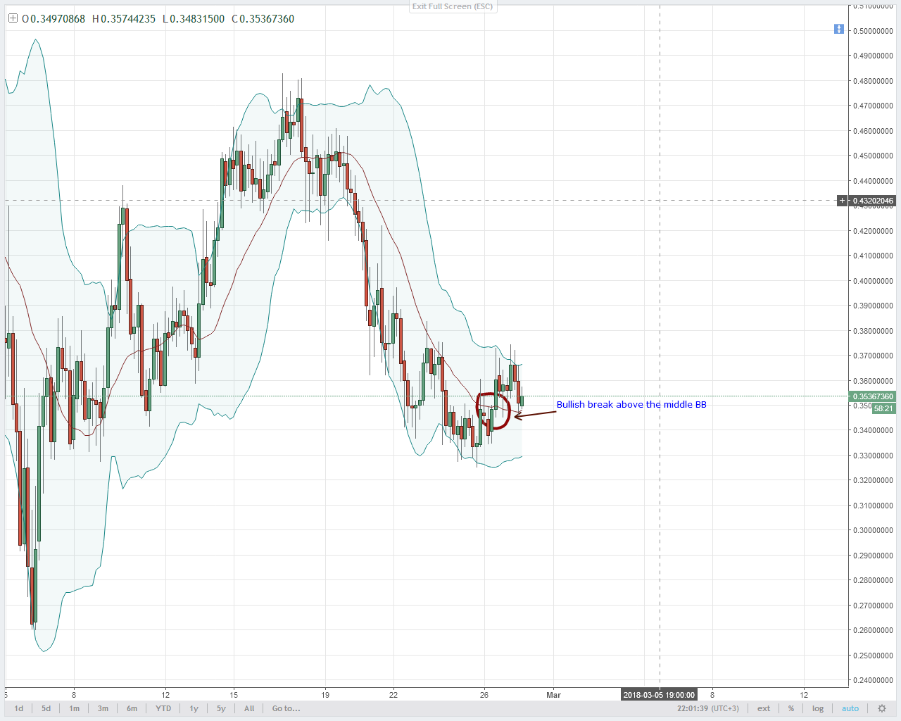 Первое связано с уровнями постепенно возрастающих минимумов недавнего бычьего прорыва выше средней BB на четырехчасовом тайм-фрейме. Во-вторых, мы не можем игнорировать влияние $0.40 - области сопротивления и бычьего индикатора на дневном тайм-фрейме.