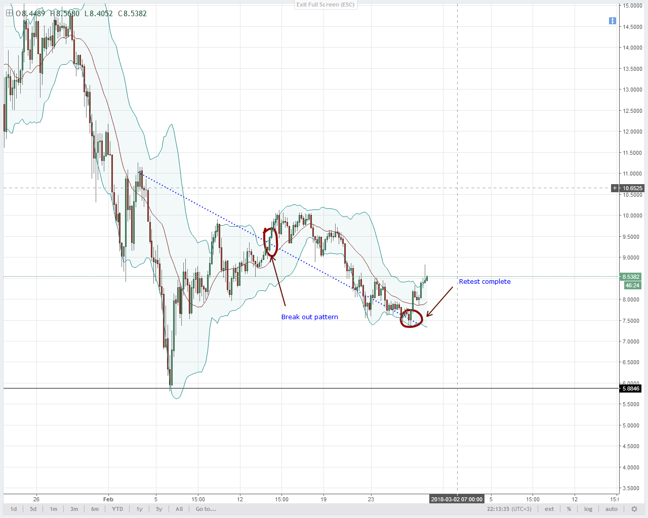 Такое положение дел, видимо, продолжится сегодня, и для тех, кто ждал бычьего подтверждения, уровень минимума 27 февраля на отметке $7.9 станет краткосрочной линией поддержки.