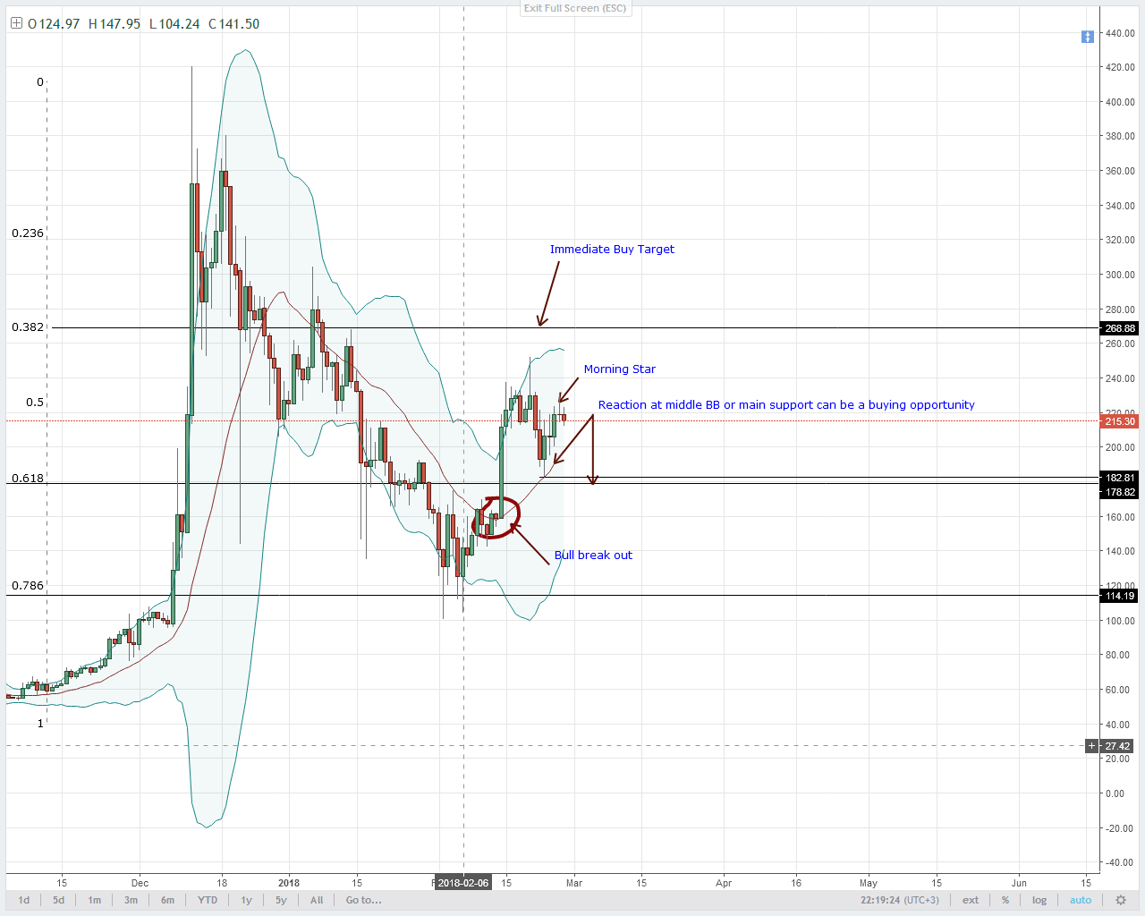 Альткоины находятся в восходящем тренде на данный момент, мы можем наблюдать растущее движение IOTA, положительную динамику на графиках EOS и в некоторой степени NEO, который, несмотря на прорыв линии сопротивления, остается восприимчивым к давлению продавцов на отметке $150