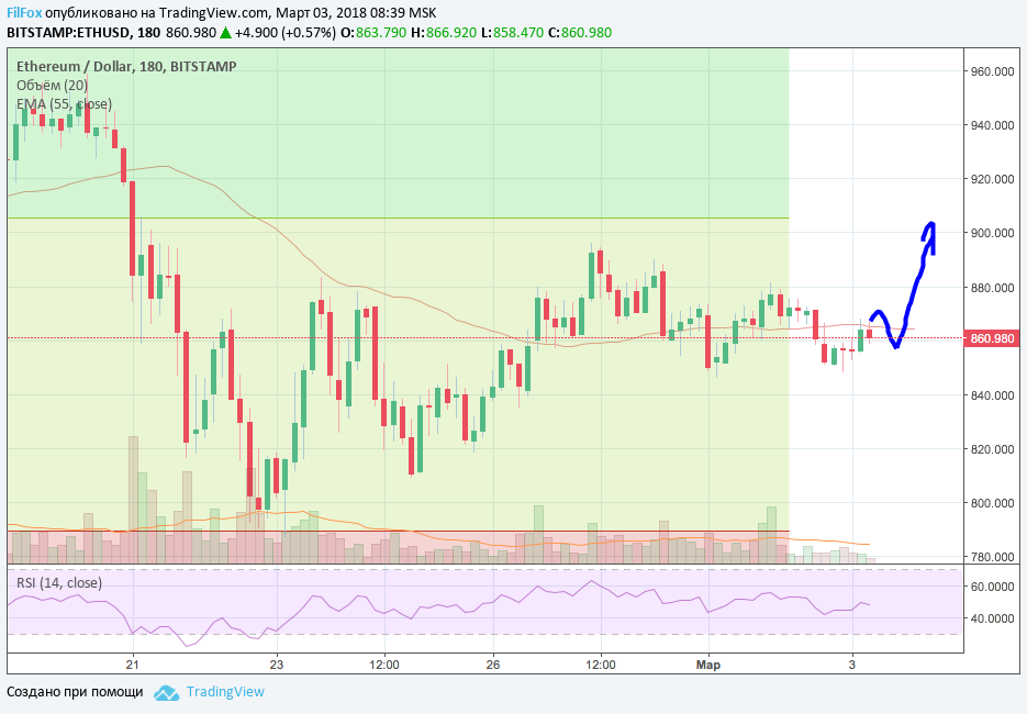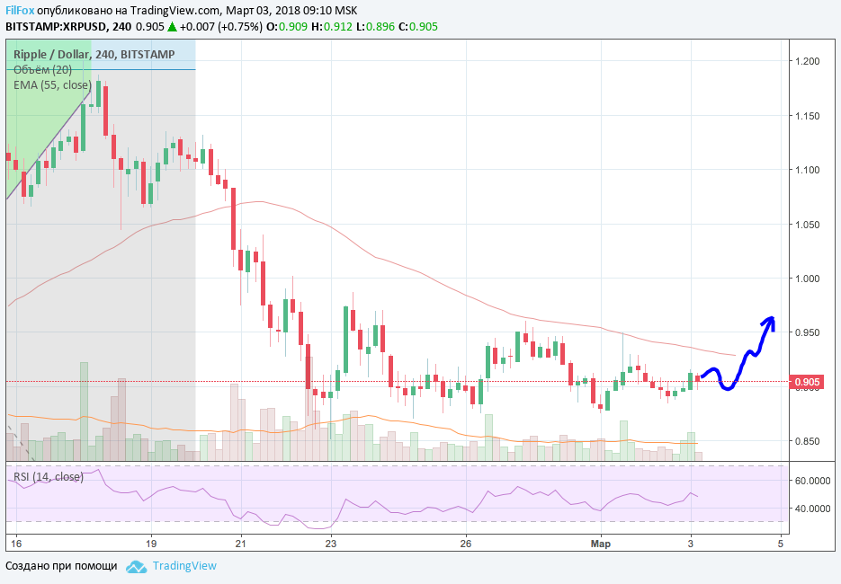 Точно такая же ситуация и с Ripple, с той только разницей, что XRP сам выбрал себе равновесное состояние на уровне 0.905 USD, вокруг которого затухает амплитуда отклонений. Этот равновесный уровень находится под линией скользящей средней EMA55, которая выступит первым уровнем сопротивления при бычьем импульсе.