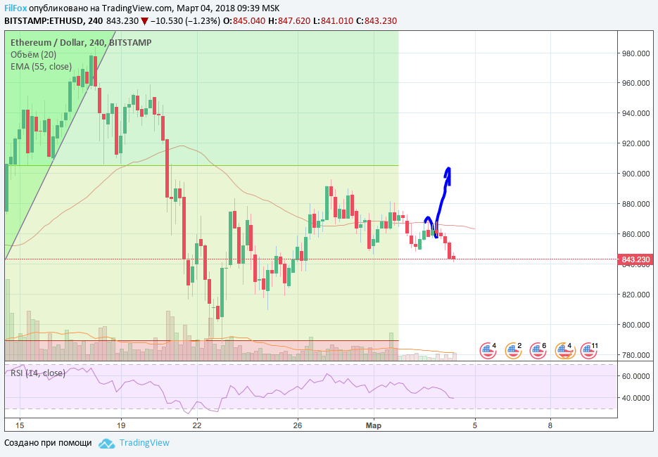 Etereum всю неделю колебался вокруг скользящей средне EMA55, а сегодня цена, отказавшись от очередного ре-теста EMA55, начала сползать к уровню поддержки, в область 820.00 USD. Снижение ETH будет продолжаться, пока цена BTC/USD, нащупав поддержку, вновь начнёт рост.