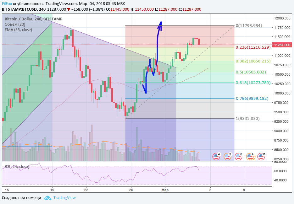 Сможет ли цена, в воскресенье, добраться до целевой отметки, установленной нами в прогнозе от 27.02.2018 на уровне 11 800.00 USD или перенесёт этот знаменательный момент на начало следующей недели, мы узнаем сегодня, 4 марта.