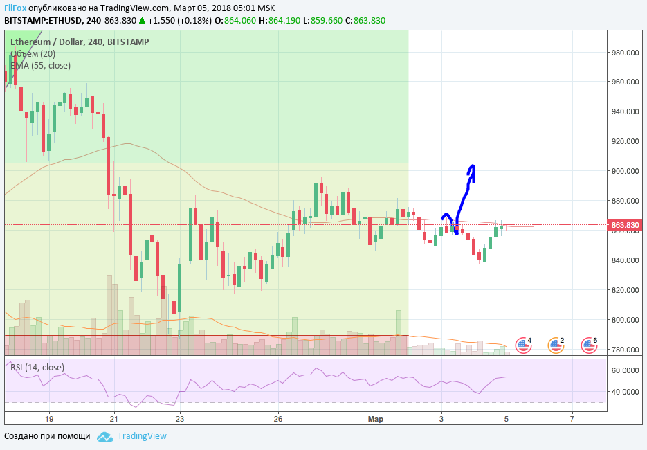 Полагаем, что начало этой недели, для Ethereum, должно ознаменоваться каким-то «пробуждением». Цена способна пробить уровень скользящей средней EMA 55 и под действием бычьего импульса покинуть боковик с понижающимися минимумами. Первым уровнем сопротивления выступает 38.2% фибо (905. 00 USD).
