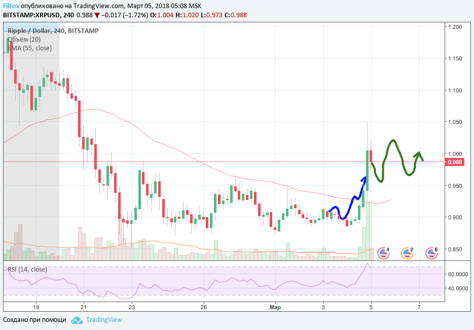 Другими словами мне было интересно, так ли сильно коррелирует цена XRP c BTC. Ответ от Ripple не заставил себя долго ждать. В последний день минувшей недели, Ripple, подхваченный бычьим импульсом, пробил уровень сопротивления скользящей средней EMA 55, и установив недельный максимум на отметке 1.049 USD, откатился чуть ниже психологической отметки "один доллар за рипл". Полагаю, что в начале недели цена будет колебаться в боковом диапазоне вокруг уровня 1.00 USD.