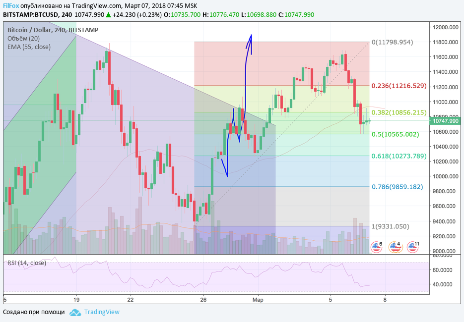 Cегодня сохраняется вероятность снижения цены к уровню сопротивления 61.8% фибо (10 273.00 USD), и если это произойдёт, то надеемся, что этот уровень сопротивления послужит уровнем разворота, и цена встретив здесь существенную поддержку, вновь начнёт восстанавливаться.