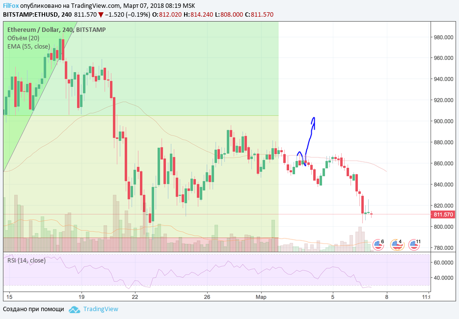 Вчерашнее падение курса BTC/USD вызвало падение пары ETH/USD. От уровня скользящей средней EMA55 цена откатилась к минимуму 802.55 USD и начала постепенно восстанавливаться. Пока открытие и закрытие четырёхчасовых свечей проходит примерно на одном и том же уровне, возле отметки 812.00 USD, но цена ещё не встретила надёжную поддержку на уровне 23.6% фибо (789.00 USD). Поэтому дальнейшая динамика, будет зависеть от цены Bitcoin: рост цены BTC будет способствовать восстановлению эфира к уровню EMA55, а медвежье давление на BTC обеспечит снижение ETH к поддержке 789.00 USD.