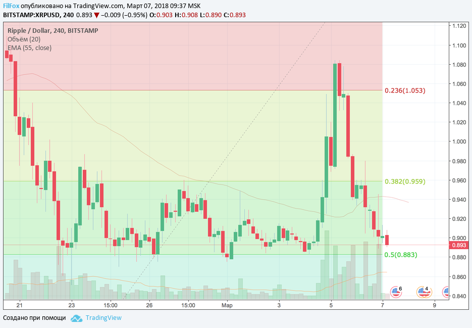 Ripple вчера вернулся в равновесное состояние, на уровне 0.905 USD, после бычьего импульса, который заставил цену протестировать максимум 1.084 USD. Сегодня предстоит ре-тест уровня поддержки 0.5% фибоначи (0.883 USD) и возврат к своему любимому равновесному состоянию 0.905 USD.