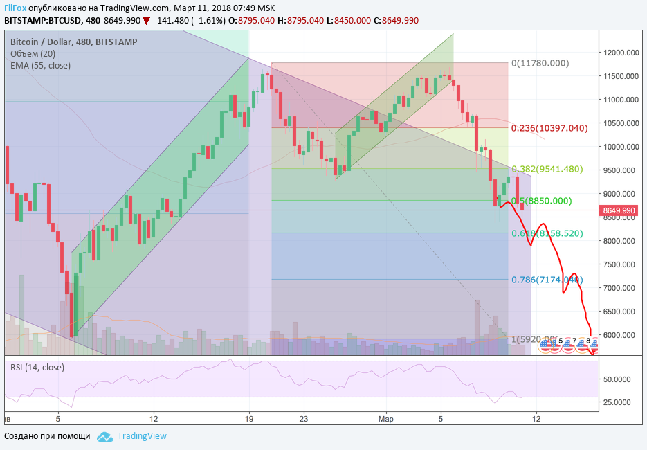 Точно такую же задачу уже приходилось решать ранее, 20 февраля. Но уровень сопротивления 11 800.00 USD оказался тогда не по зубам Bitcoin. Пятого марта цена во второй раз отступила от этого уровня сопротивления, откладывая штурм высоты на потом. А во вторник, вместо обновлённого максимума, мы зафиксировали откат к минимуму 10 560.00 USD. Среда и четверг были провальными днями, когда цена обновляла минимумы, пробивая один за одним уровни поддержки. Всё происходило на негативных новостях о возобновлении попыток жесткого регулирования деятельности бирж. Такую острую реакцию на фундаментальные события предугадать было довольно сложно. И только в пятницу, 9 марта, падение курса замедлилось и цена смогла немного восстановиться.