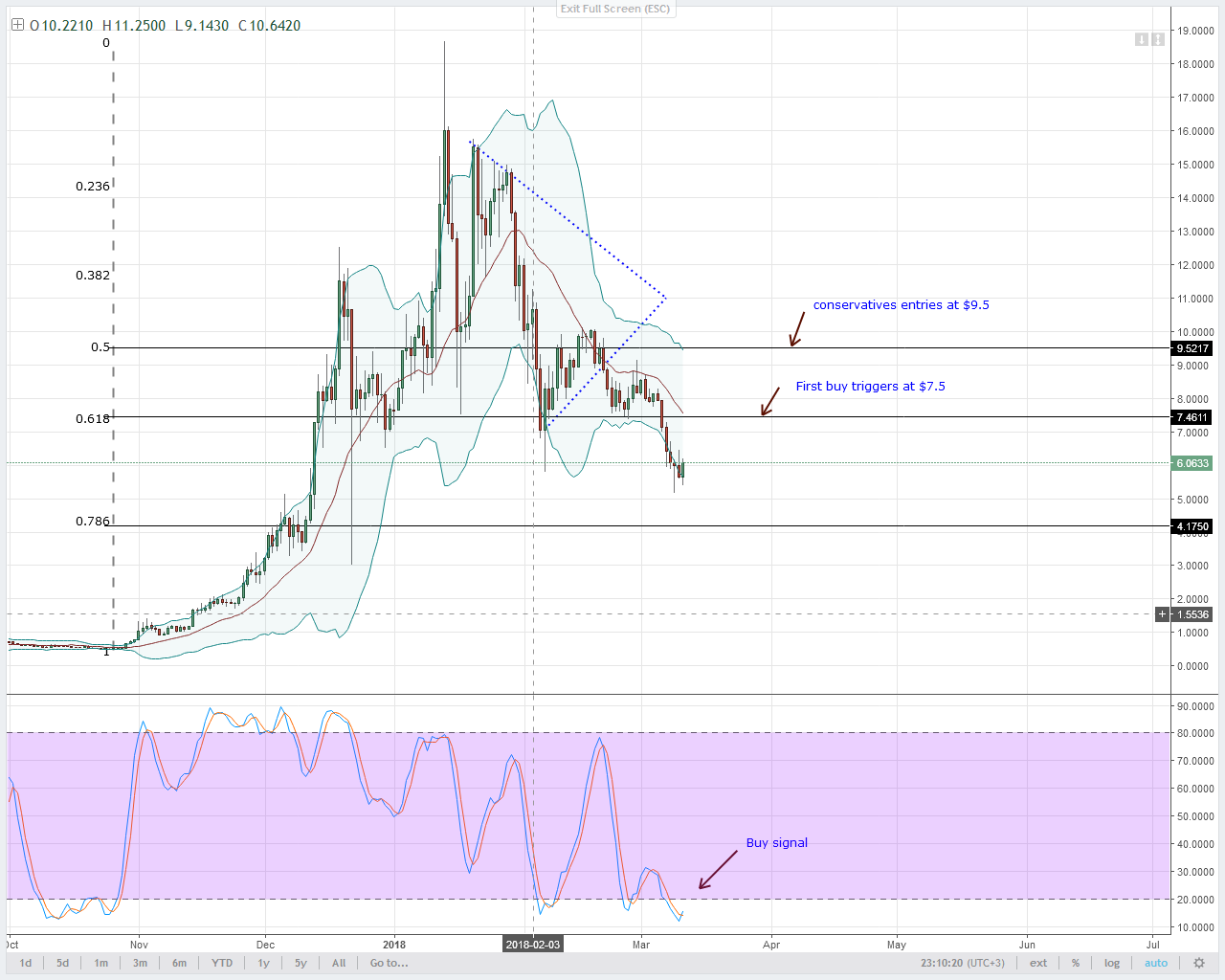 На мой взляд, учитывая перепроданость стохастика, покупатели EOS должны ждать возможности для длинного входа на краткосрочный период. Стопы стоит размещать на минимумах, которые были 9 марта на отметке в $5.2.