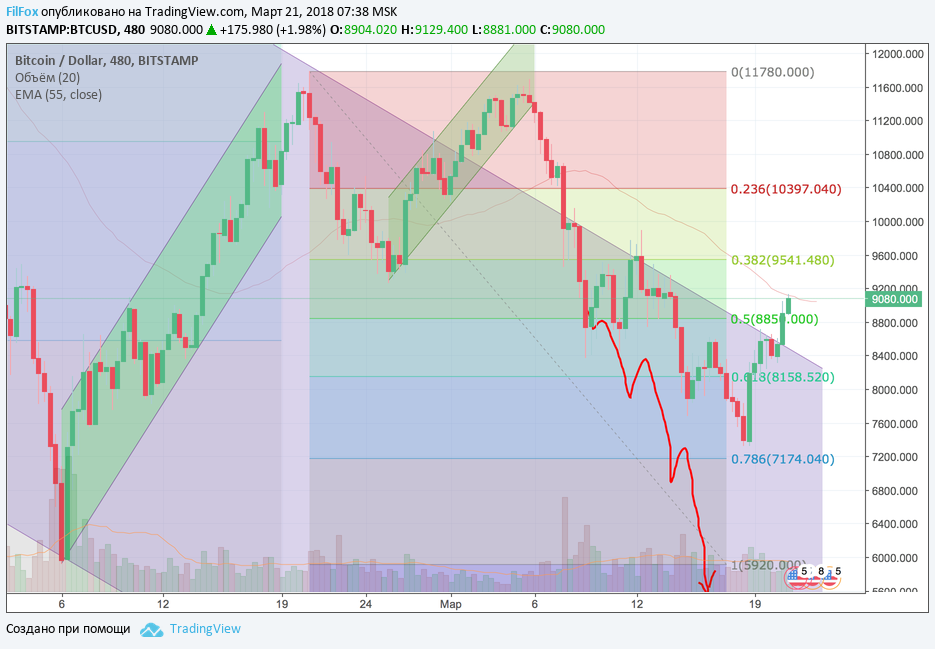 В отсутствии явно негативных фундаментальных новостей курс Bitcoin за последние четыре дня, после минимума на отметке 7325.00 USD, установленного 18 марта, восстановился уже на 18% и продолжает расти. Полагаем, что сегодня цена пары BTC/USD сможет достигнуть 38.2% уровня фибоначи (9 541.00 USD), если сможет преодолеть сопротивление скользящей средней EMA55, которая находится в области 9 130.00 USD на восьмичасовом тайм-фрэйме.