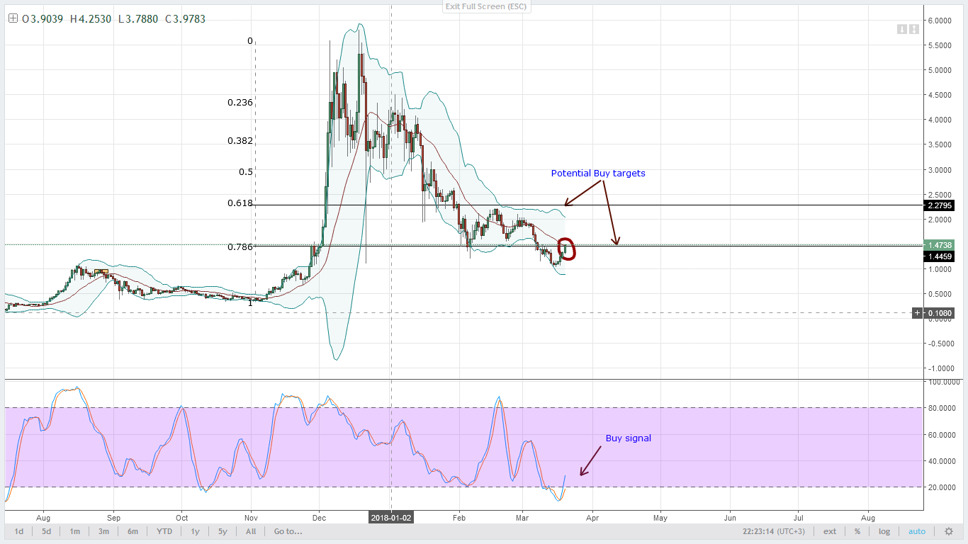 Обратите внимание, что на данный момент цены тестируют среднюю BB и 78.6% фибоначчи. Мой прогноз остается бычьим в краткосрочной перспективе, я рекомендовал бы покупать с целью на отметке $2.2 или 61.8% фибоначчи.