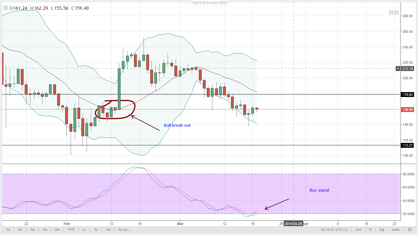 Цены NEO в последний раз торговались выше средней BB в конце февраля. И это несмотря на сильный бычий прорыв, который сейчас происходит. Взгляните на стохастик, и вы увидите сигнал покупки с расходящимися линиями %k и %d.