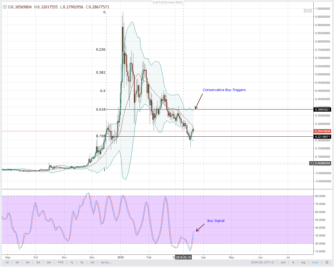 Продавцы нашли серьезное сопротивление на уровне средней BB, которая и раньше была огромным препятствием для быков. Несмотря на это, я по прежнему рекомендую покупать, нацеливаясь на $0.40 или больше, если цена сможет уверенно преодолеть и закрепится выше средней BB.