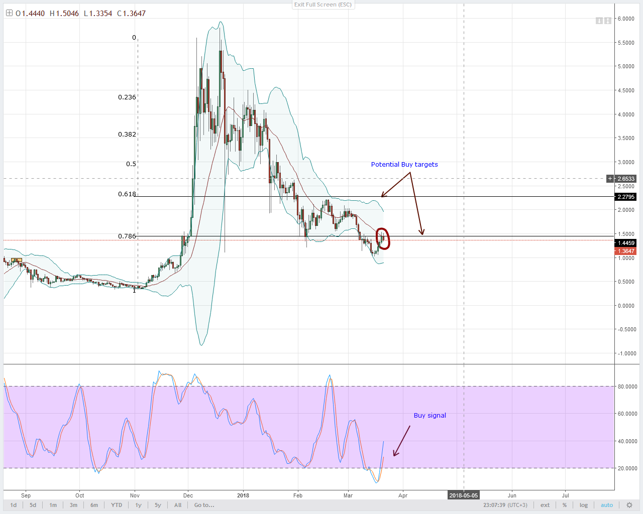 Судя по графикам, покупатели IOTA встретили серьезное сопротивление на уровне средней BB и 78.6% фибоначчи на отметке $1.45.