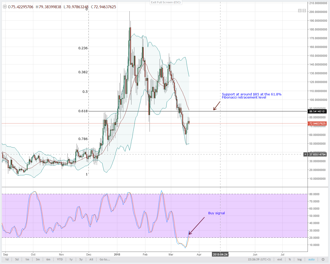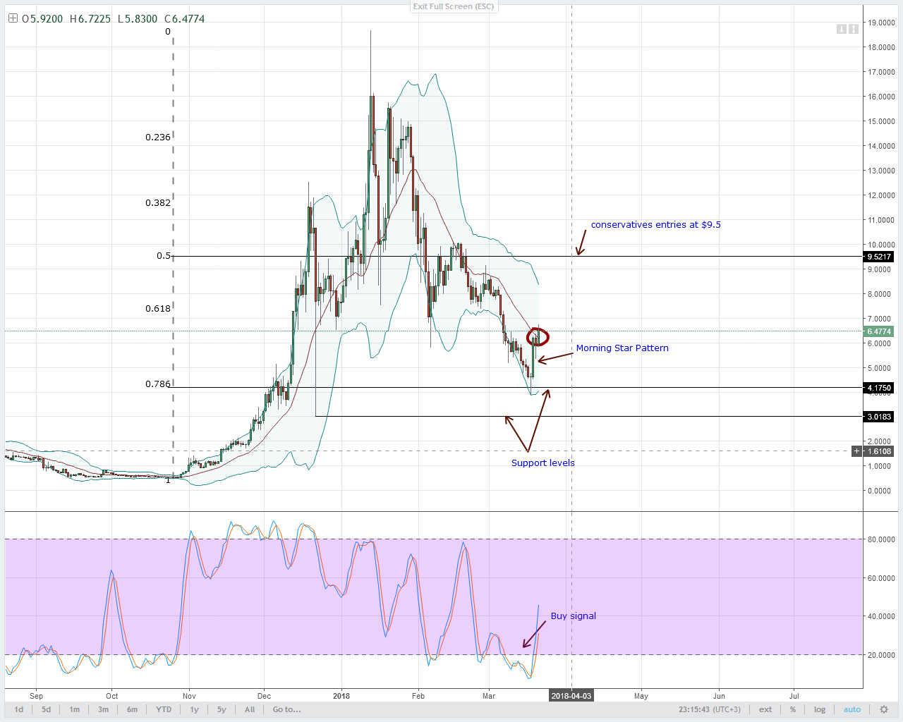 Впервые после медвежьего давления 30 января покупатели EOS смогли протолкнуть цену выше средней BB. Кроме того, бычья свеча 21 марта стала подтверждением паттерна “утренняя звезда”, что сигнализирует о высоком потенциале дальнейшего роста цен.