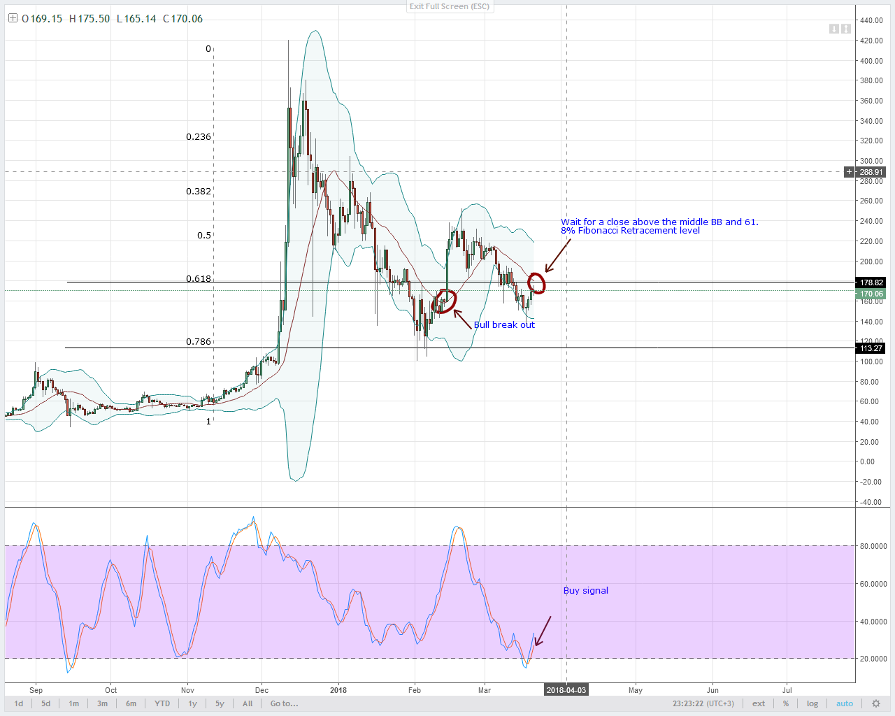 Судя по вчерашней свече, давление продавцов и покупателей примерно одинаково. Однако, учитывая восстановление цены, шансы на то, что LTC ждет рост очень велики. Я бы рекомендовал длинные входы с первой целью на отметке $190. Как можно увидеть на графике, это чуть выше 61.8% фибоначчи.