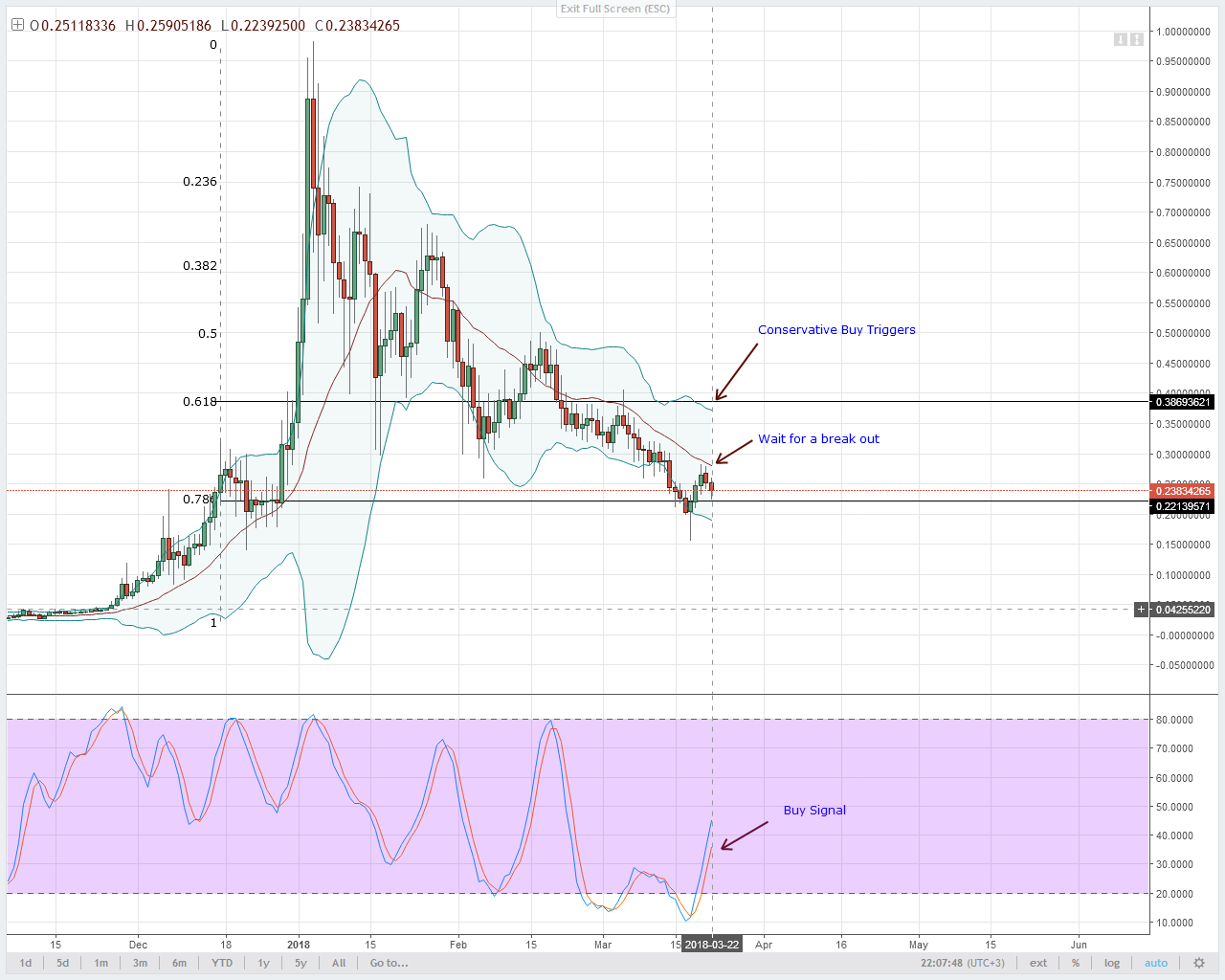 Пока что наши условия не соблюдены, поэтому нам надо дождаться пока цены закроются выше максимальной отметки 22 марта $0.28 на дневном графике.