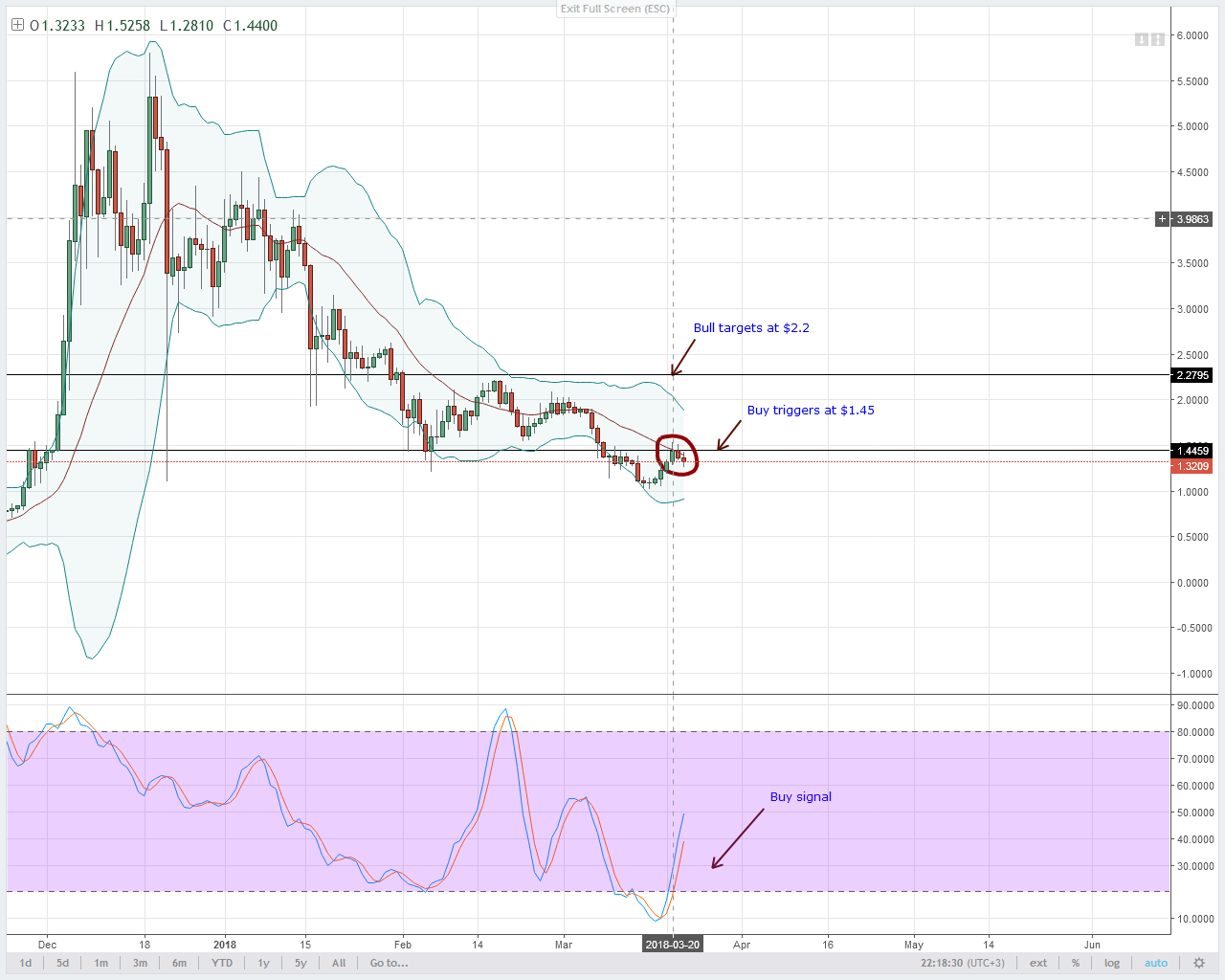 Для того, чтобы наш прогноз за 21 марта сбылся, цены IOTA должны сегодня пойти вверх и закрыться выше средней BB и $1.45. Эта отметка является ключевой в нашем анализе.