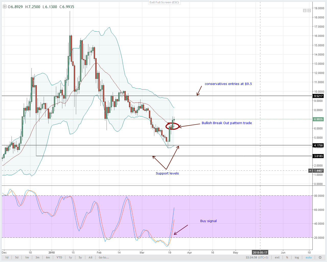 Однако EOS, похоже, чувствует себя неплохо - цена выросла на 8% и составила $7, рыночная капитализация EOS составляет $5.2 миллиарда. После анонса об подписании партнерства с FinLab AG, покупатели держали цену выше средней BB и $6 на дневном тайм-фрейме. Давайте посмотрим на графики: