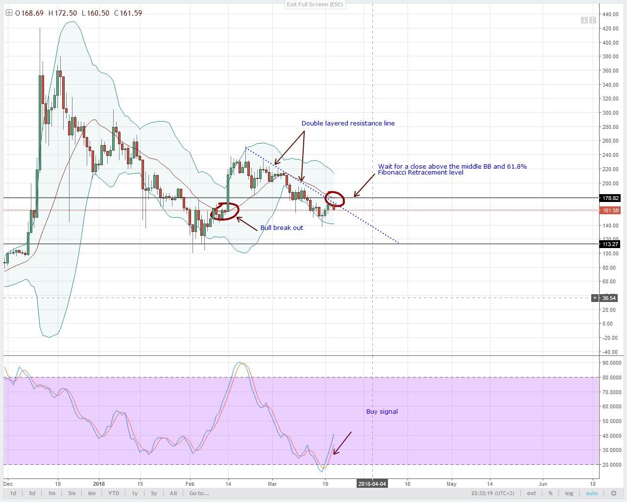 Средняя BB и линия тренда сопротивления дополняют друг-друга в ограничивая цену LTC. Помните, что мы торгуем по бычьей стратегии и любой прорыв этого двухуровневого сопротивления будет означать, что продавцам надо нацеливаться на $190.