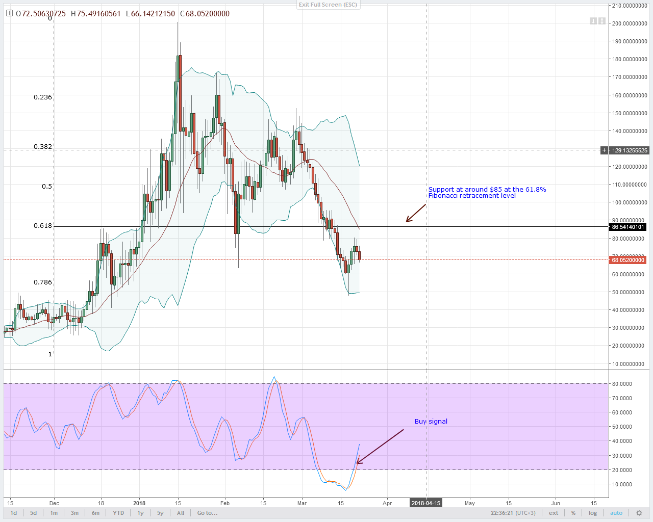 До того момента покупатели должны быть крайне осторожными и ждать реакции на уровне $0.22, 78.6% фибоначчи. Помните, идеальный план - начинать размещать длинные позиции при сигнале стохастика на покупку на четырехчасовом тайм-фрейме.