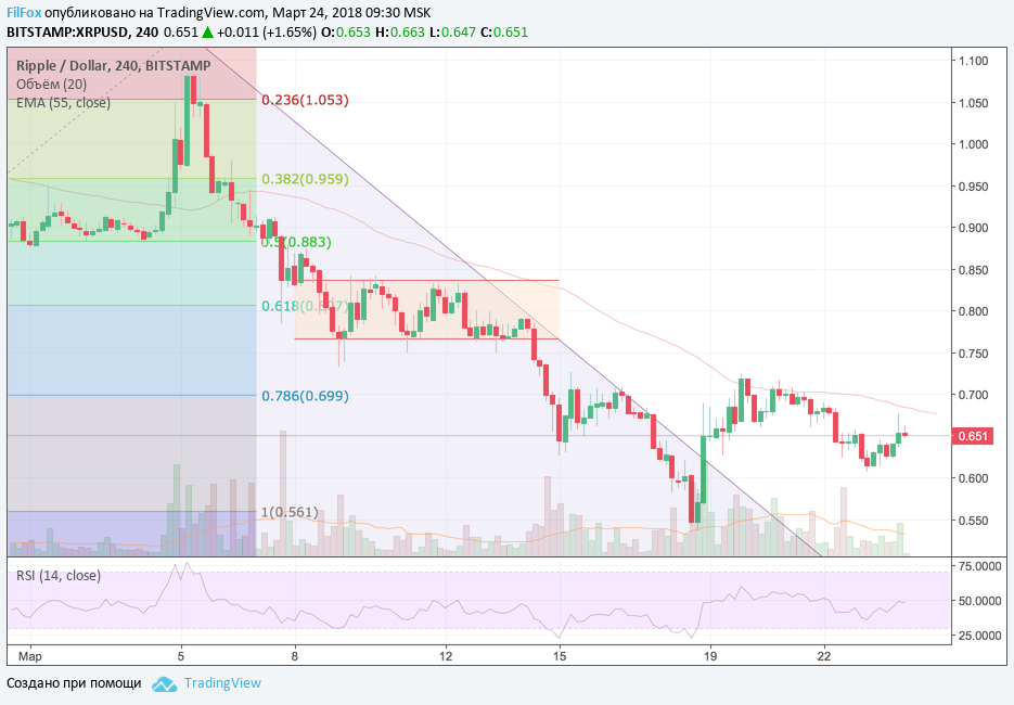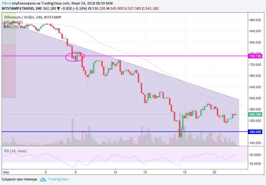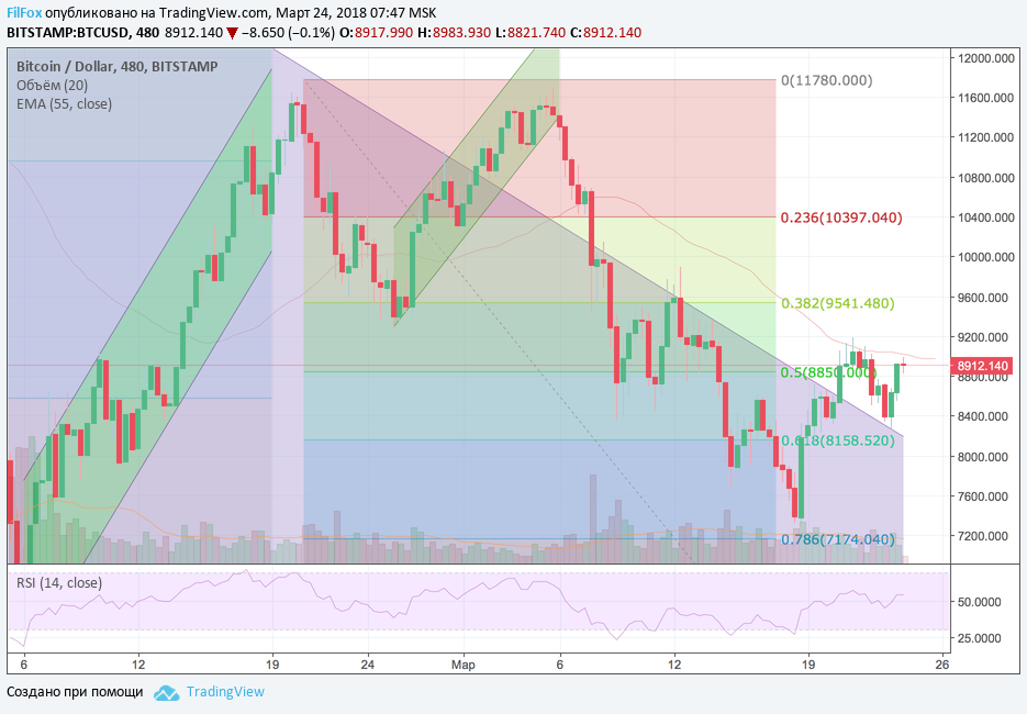 Bitcoin вчера начал день со снижения и в первой половине дня, испытывая медвежье давление, вплотную приблизился к верхней границе фиолетового коридора. Коснувшись её, цена установила дневной минимум на отметке 8 265.00 USD. К концу дня курс восстановился к уровню поддержки 50% фибоначи (8850.00 USD). Несмотря на то, что 50-процентный уровень изображается только для наглядности, всё равно можно заметить, что цена с 20 по 22 марта уже использовала его как уровень поддержки и консолидировалась над ним.