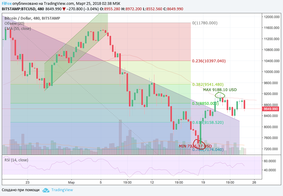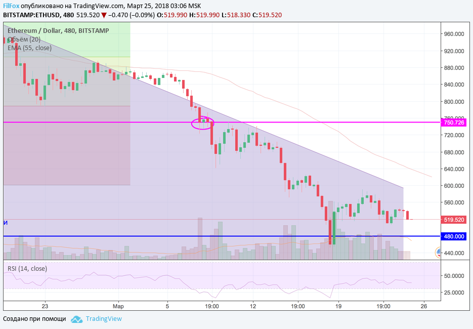 Когда в прошлое воскресенье курс Bitcoin установил мартовский минимум на отметке 7325.00 USD, показатель относительной силы RSI был на границе зоны перепроданности. Цена могла бы пойти ещё ниже, но в поддержку криптовалюты высказался глава Банка Англии Марк Карни, который повторил уже известный всем тезис о том, что криптовалюта пока не несёт угрозы мировой экономике из-за малой капитализации. Но для инвесторов эти слова из уст Марка Карни прозвучали как вдохновляющая речь предводителя перед штурмом крепости.