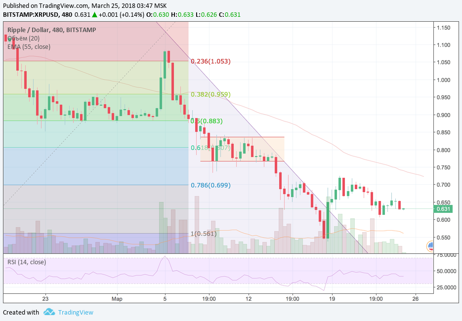 «Не отрывался от коллектива» и Ripple. Когда нужно было восстанавливаться - рипл послушно рос. Только свой недельный максимум установил досрочно, в понедельник, а не в среду, как все «нормальные» альткоины. Всё разнообразие динамики цены со вторника по воскресенье можно описать, пожалуй, двумя словами: «рипл снижался». На текущий момент минимум пятницы - 0.607 USD, после субботнего отскока, ещё не обновлён, но мы полагаем, что сегодня это всё-таки произойдёт.