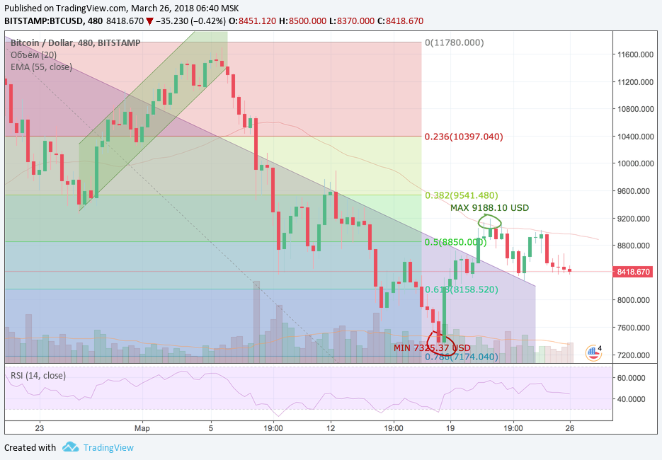 Снижение курса Bitcoin вчера существенно замедлилось. Цена BTC/USD встретила поддержку на уровне 8 400.00 USD и хоть всё воскресенье пара пыталась консолидироваться над этим уровнем, на восьмичасовом тайм-фрэйме мы видим только красные свечи. Понижающиеся цены закрытия говорят о том, что цена по-прежнему находится под медвежьим давлением. Инвесторы с тревогой наблюдают за ходом развития событий, связанных с проверкой Комиссией по ценным бумагам США (SEC) хедж-фондов и тех инвестиционных компаний, которые принимали участие в ICO и вложили в них свои средства.