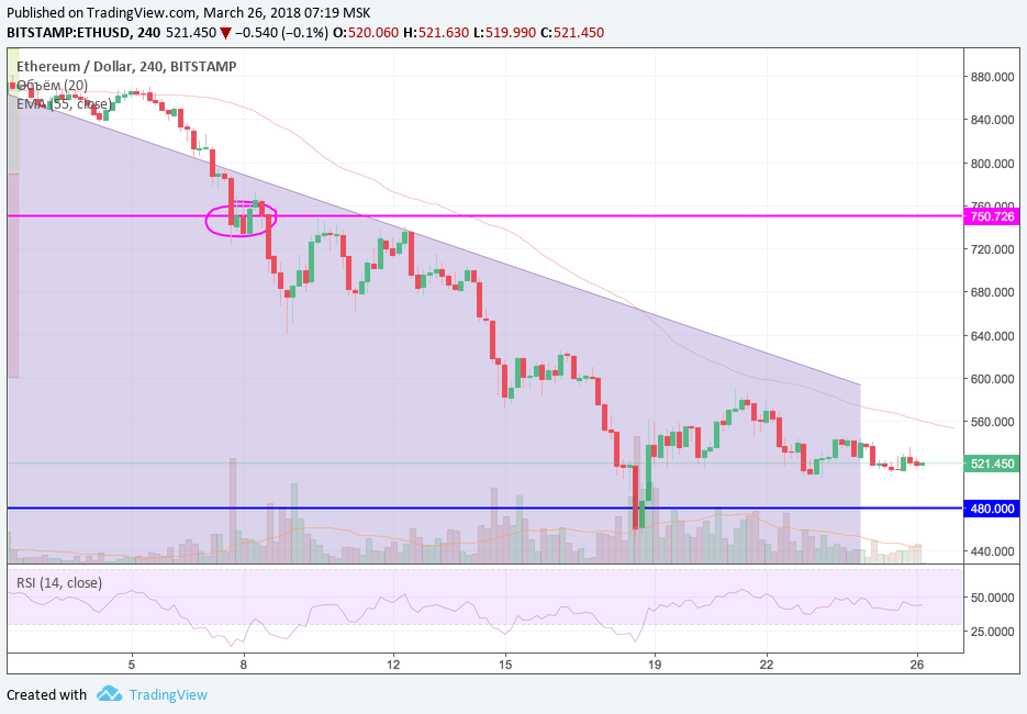 Ethereum вчера весь день провел в сужающемся боковом диапазоне, возле уровня 520.00 USD. На четырёхчасовом тайм-фрэйме снижающаяся скользящая средняя EMA55 будет ограничивать рост эфира, выступая уровнем сопротивления на отметке 555.00 USD. Снизу боковик поддерживает горизонтальная линия на уровне 480.00 USD. Усиливающийся негативный новостной фон будет продавливать смещение боковика к этому уровню поддержки.