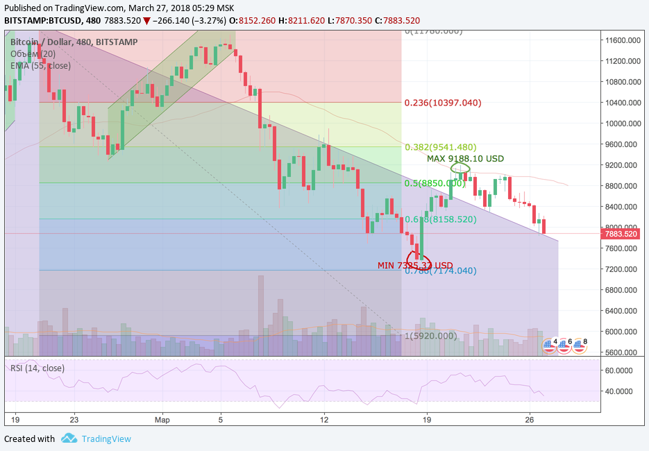 Как мы вчера и предполагали, цена BTC/USD протестировала верхнюю границу фиолетового коридора глобального даун-тренда в точке минимума 7831.00 USD. На уровне 7800.00 USD просматривается уровень поддержки, поэтому после восстановления, возможно цена ещё несколько раз попытается пробить его, а может это удастся и со второго раза. Целевой отметкой такого пробоя является минимум 18 марта, на уровне 7325.00 USD. В ближайшее время цене предстоит обновить его.