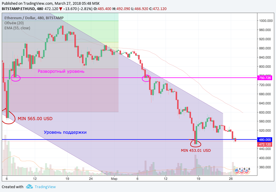 Ethereum вчера проколол синий уровень поддержки 480.00 USD, а сегодня пробил его. Ближайшая цель эфира - это обновить минимум от 18 марта на уровне 453.01 USD. Полагаем, что ближайший уровень поддержки для консолидации находится в области цен 420.00 долларов за эфир.