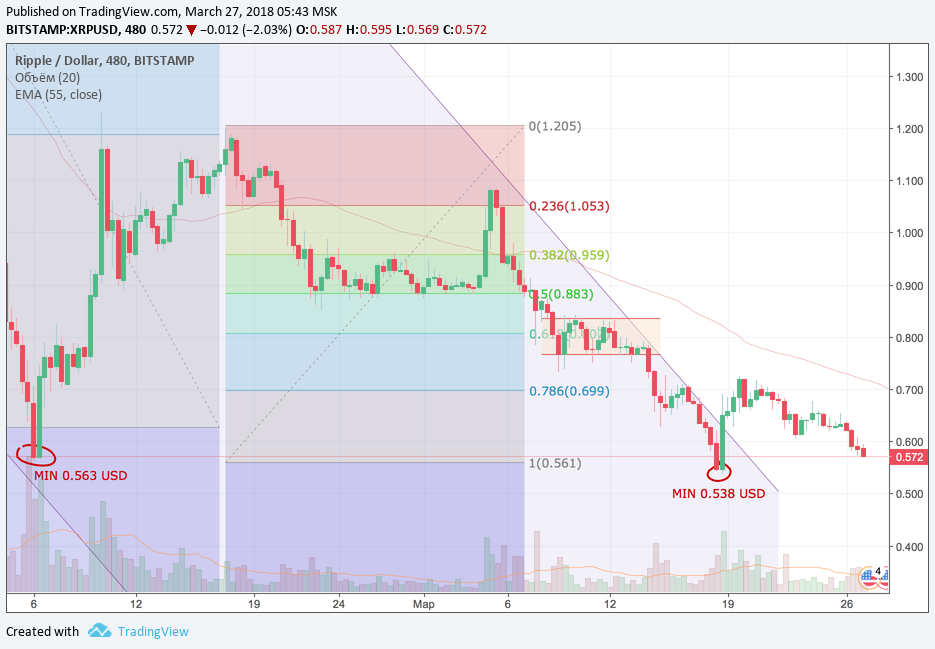 Сегодня цена на Ripple преодолеет сто процентный уровень поддержки фибоначи 0.561 USD и побьёт рекорд сразу двух ключевых минимумов: от 6 февраля на отметке 0.563 USD и 18 марта - 0.538 USD. На уровне 0.538 USD находится достаточно сильный уровень поддержки, так что, возможно, цена существенно замедлит на нём своё падение и попытается консолидироваться над этим уровнем.