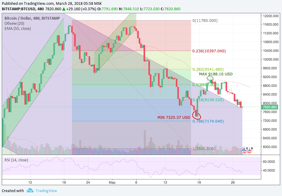 Как видно из графика, цена Bitcoin продолжает соскальзывать к целевой отметке - 7 325.00 USD (минимум 18 марта). Однако индикатор относительной силы RSI подходит к границе перепроданности, а цену BTC/USD так до сих пор не удалось продавить ниже верхней границы глобального даун-тренда. Как мы и предполагали цена уже несколько раз протестировала эту верхнюю границу, но так и не вошла в фиолетовый коридор.
