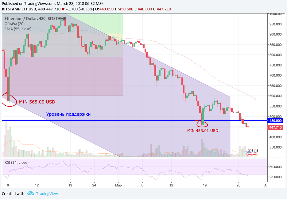 Настроения по Ethereum, пожалуй, самые пессимистические из тройки основных криптовалют BTC, ETH, XRP. Цена смогла побить рекорды минимумов за 6 февраля и 18 марта при этом уже преодолела ключевой уровень поддержки на отметке 480.00 USD. Надеемся, что следующий уровень поддержки, который мы вчера определили на отметке 420.00 USD, окажется более надёжнее, и развернёт цену на восстановление для консолидации в боковом диапазоне.