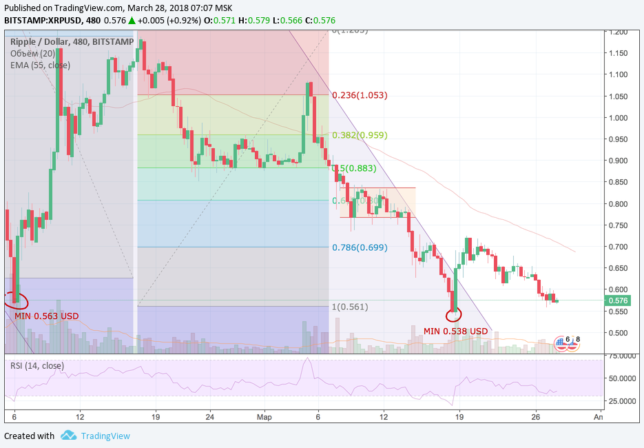Сто процентный уровень поддержки фибоначи 0.561 USD оказался довольно прочным для курса Ripple, и цена вчера смогла консолидироваться над этим уровнем. Однако, всё же установила дневной минимум на отметке 0.557 USD, что бьёт февральский рекорд на отметке 0.563 USD. В виде потенциальной цели остаётся ещё минимум 18 марта - 0.538 USD. Полагаем, что сегодня эта цель может оказаться недосягаема для рипл, так как RSI подходит к зоне перепроданности. Более вероятнее выглядит продолжение консолидации над 100% фибо (0.561 USD)