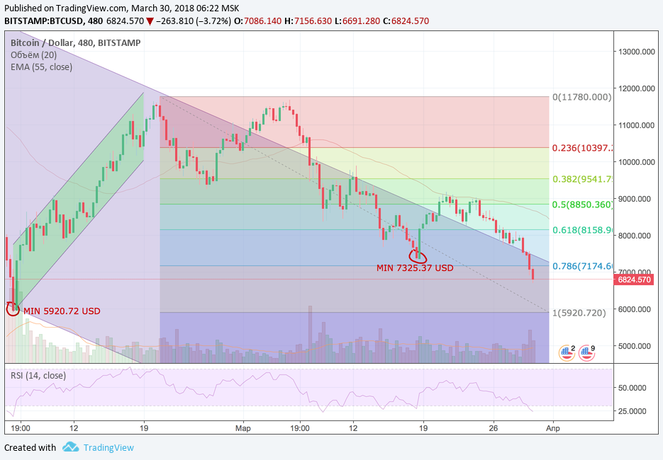 Вчера цена на Bitcoin, подталкиваемая негативными новостями из Японии, вошла в коридор даун-тренда и обновила минимум 18 марта, после чего уверенно направилась к минимуму 6 февраля. Это разворотный уровень сопротивления, но по нашим прогнозам, которые мы делали ранее, скорее всего, он будет пробит.