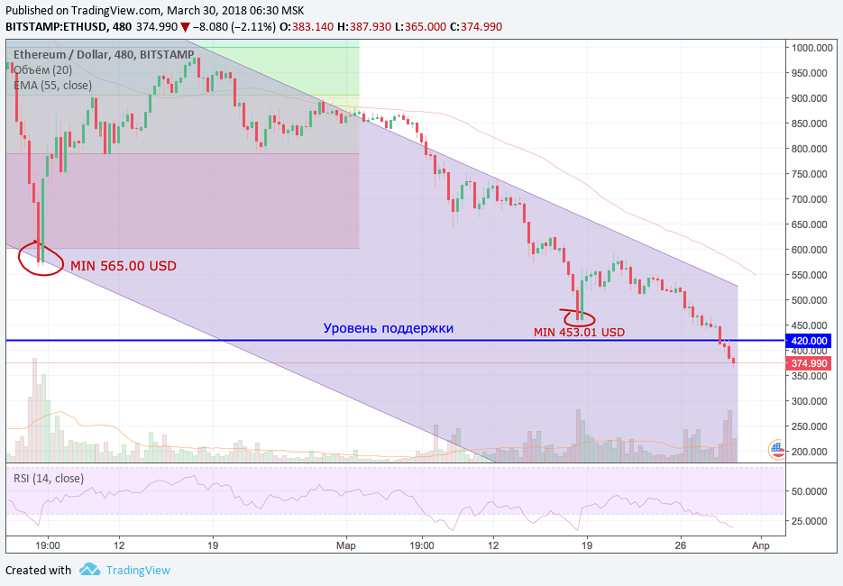 Ethereum вчера без особых трудностей пробил уровень поддержки на отметке 420.00 USD. Показатели индикатора RSI вылетели в зону перепроданности, поэтому, где-то с текущего уровня цен, курс начнёт консолидироваться. Сомневаемся, что будет хоть какое-то восстановление к уровню 420.00 USD, но по теории технического анализа, оно довольно вероятно, в виде теста снизу. Ближайший уровень поддержки, мы полагаем, может находится на уровне 333.00 USD.