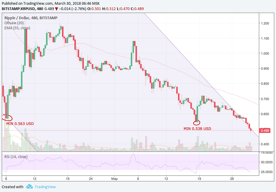 Ripple вчера, увлекаемый парой BTC/USD, обновил минимум 18 марта, установленный на уровне 0.538 USD и сегодня уже успел отметиться на локальном минимуме 47 центов за рипл. Примерно на этом уровне, когда-то давно, находился неслабый уровень сопротивления. Надеемся сейчас он послужит уровнем поддержки для рипл, так как RSI "зашкаливает" в зоне перепроданности.