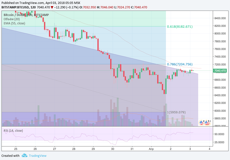 Начавшееся вчера восстановление цен на Bitcoin ещё не завершилось. Достигнув в понедельник уровня 7 033.00 USD пара BTC/USD не остановилась на достигнутом и продолжила движение вверх, пока не наткнулась на верхнюю границу нисходящего тренда. На двухчасовом тайм-фрэйме наглядно видно насколько сильным уровнем сопротивления является эта граница. Установив дневной максимум на отметке 7106.00 USD, цена весь день боролась, чтобы вырваться за пределы фиолетового коридора даун-тренда.