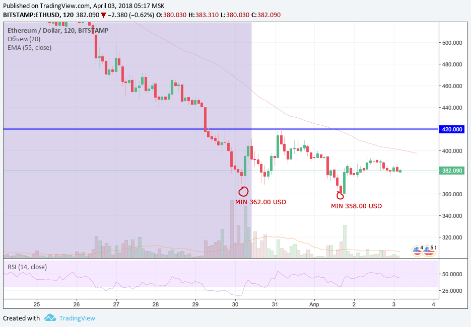 Так как пара BTC/USD продолжала вчера консолидироваться на границе коридора даун-тренда, то и пара ETH/USD, тоже двигалась в боковом диапазоне, возле уровня поддержки 380.00 USD. Сегодня ещё сохраняется вероятность протестировать уровень сопротивления в виде скользящей средней EMA 55, но если Bitcoin в первой половине дня начнёт демонстрировать негативную динамику, то первый апрельский максимум так и останется на уровне 395.00 USD. Целевые уровни снижения эфира уже определены ранее - это уровень поддержки 333.00 USD.