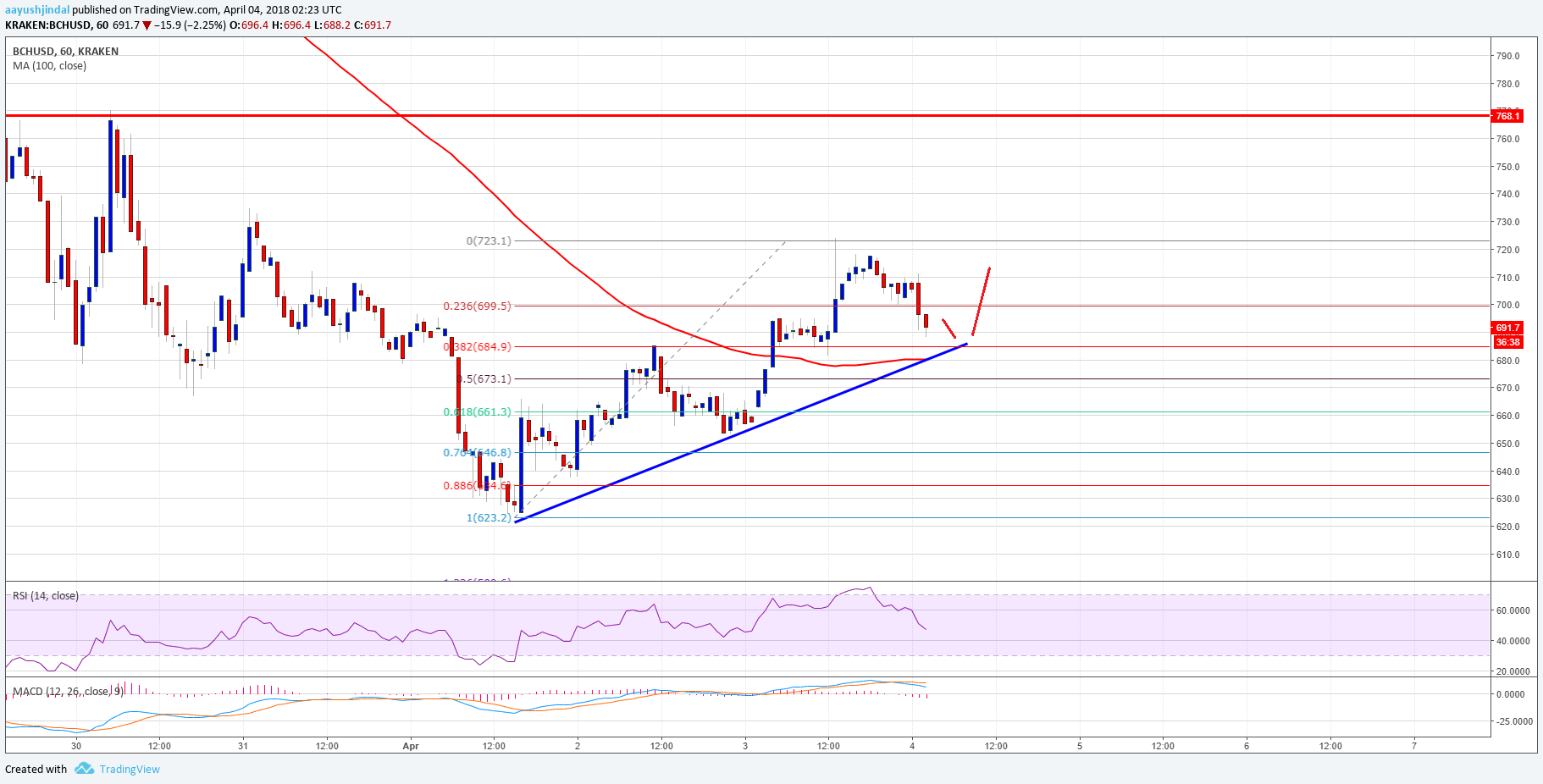 Цена BCH продолжила восстановление выше уровня $675. Цена поднялась выше и прорвала уровень сопротивления $680. Позднее, она сумела преодолеть отметку $700. На данный момент bitcoin cash торгуется выше отметки $680 и 100 часовой MA. Тем не менее, рост цены был остановлен в зоне $723-725.