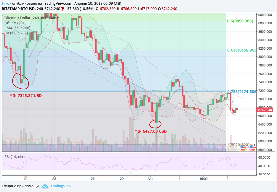 Вчера третий коррекционный импульс заставил цену протестировать 78.6% фибоначи, установив дневной максимум на отметке 7175.00 USD. После этого падание Bitcoin возобновилось. Цена пробила уровень поддержки 6800.00 USD и предприняла попытку консолидироваться под ним.