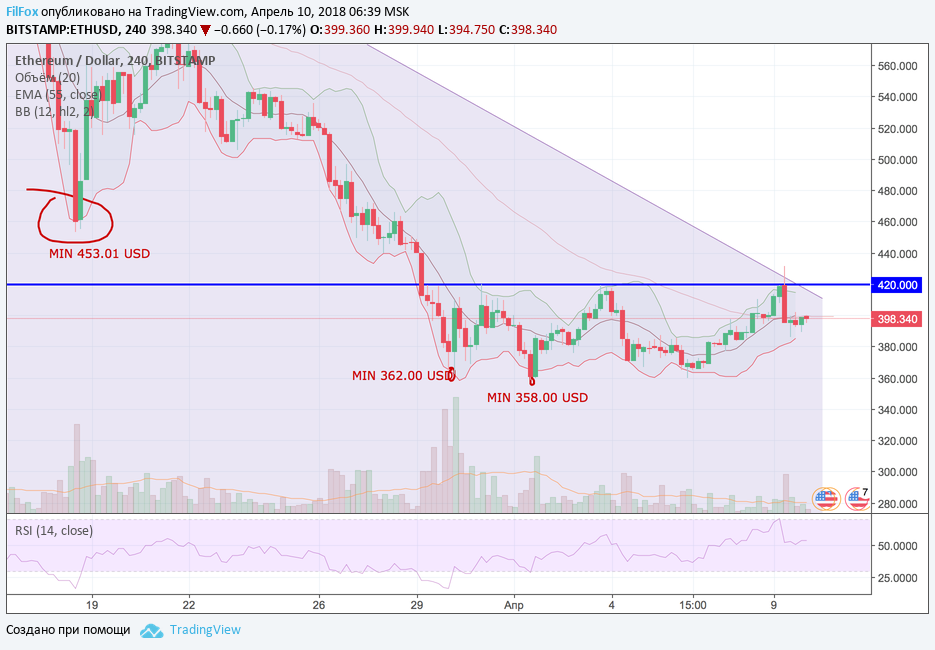 Ethereum вчера проколол ключевой уровень сопротивления 420.00 USD и в попытке протестировать верхнюю границу коридора нисходящего тренда, обновил апрельский максимум на отметке 431.00 USD. Когда бычий импульс иссяк, цена резко вернулась к средним ценам, уровень которых показывает EMA55. После непродолжительной консолидации на этом уровне цена возобновит снижение к апрельскому минимуму.