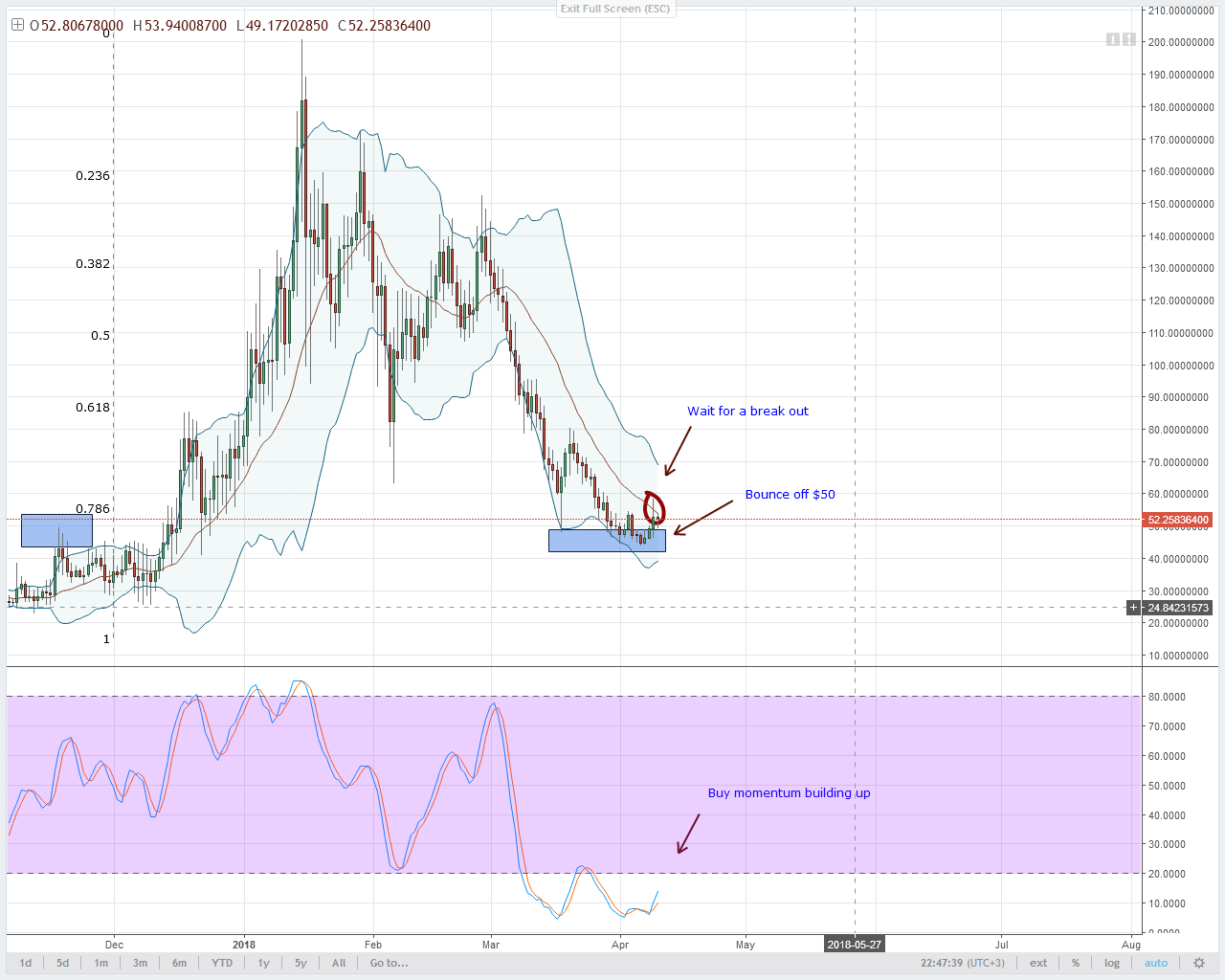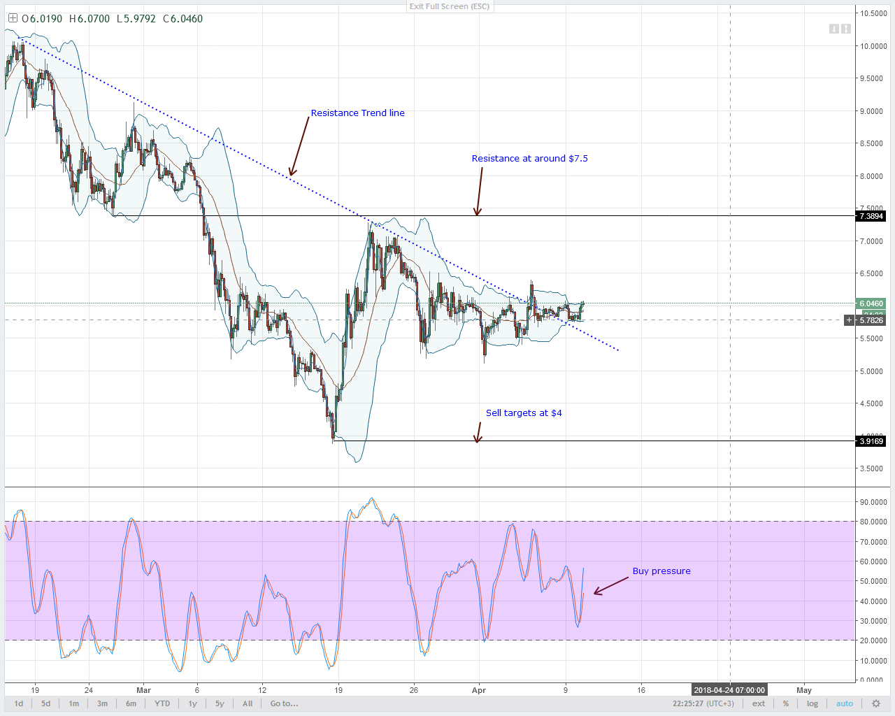 В долгосрочной перспективе я бы не делал бычьих прогнозов, однако, на данный момент, я бы рекомендовал краткосрочные покупки с целью на отметке $7.5. Мы можем торговать, пока не увидим перемену направления движения цен на четырехчасовом тайм-фрейме. Сейчас покупатели доминируют, я ожидаю, что сегодня EOS поднимется в цене еще на 4%.