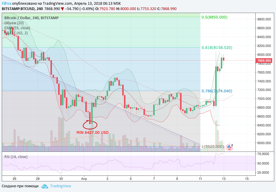 В нашем вчерашнем прогнозе мы говорили о том, что если цене удасться пробить уровень сопротивления скользящей средней EMA55, то вполне вероятен ре-тест уровня 78.6% фибоначи (7104.00 USD). Однако вчера события получили своё развитие ещё больше. Ре-тестом 78.6% фибо дело не закончилось. Цена пробила этот уровень сопротивления и росла, пока не достигла максимума на отметке 8069.00 USD.