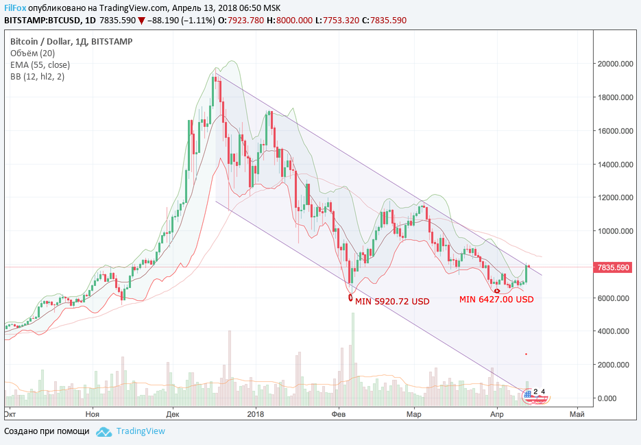 Утверждается, что если границы коридора нисходящего тренда, на дневном тайм-фрэйме, провести через крайние точки, как показано на рисунке, ниже, то можно увидеть, что график цены BTC, вчерашним бычьим импульсом, тестирует верхнюю границу коридора перед очередным снижением.
